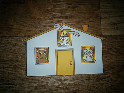 Из детской книги или журнала вырезаем подходящую картинку. В нашем случае это будет домик с животными, которые выглядывают из окошек.