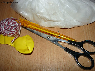 Для поделки вам потребуется воздушный шарик, крахмал, нитки для вязания, ручка, ножницы.