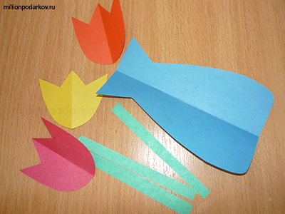 Вырежьте из цветной бумаги силуэты тюльпанов и силуэт вазочки.