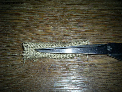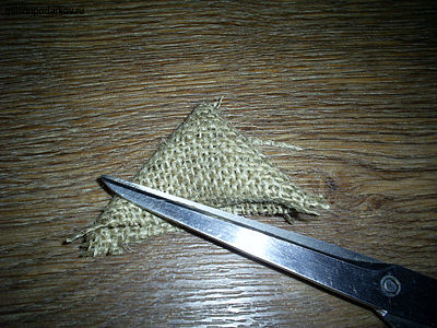 Делаем шапочку из вырезанного из мешковины треугольника. Приклеиваем ее к голове.