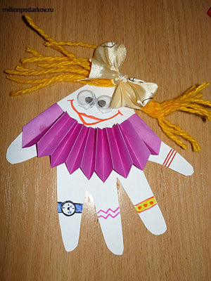 Обводим ладошку вашей дочки, затем выстригаем ладошку из бумаги. Из кусочка цветной бумаги делаем гармошку,это будет юбка,подгоняем её по размеру,для нашей осьминожки. Делаем из кластеров от таблеток глазки. Сворачиваем нитки несколько раз, перевязываем по середине,это будут волосы. Из атласной ленты делаем бантик.