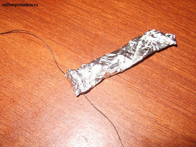 По всей длине нитки делаем такие шарики. Шарики из фольги делайте на расстоянии друг от друга. Когда вы по всей длине нитки сделаете шарики из фольги, поделка будет готова.