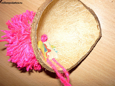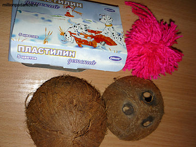 Продеваем в глазок кокосового ореха кончик нитки от помпона. Затем закрепляем его пластилином.