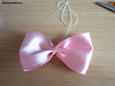 Отрезаем 20 см от ленты, обжигаем края. Прошиваем по-середине, так чтобы получился бантик.