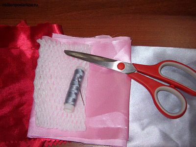 Для поделки из лоскутков «Букетик» нам понадобятся лоскутки ткани, причем нам нужны длинные, но не обязательно широкие, лоскутки. Также нам нужны будут сетка, ножницы и нитки.