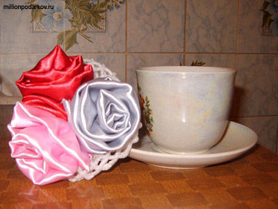 Все три цветка сшиваем вместе. Затем сетку складываем пополам и вкладываем туда цветы, пришиваем сетку к цветам и завязываем бантик. Поделка из лоскутков «Букетик» готова.