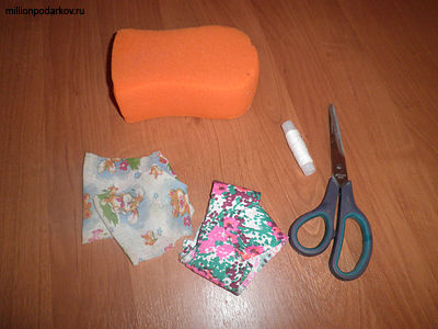 Чтобы сделать поделки из отходов нужно подготовить старую губку, кусочки ткани, нитки и ножницы.