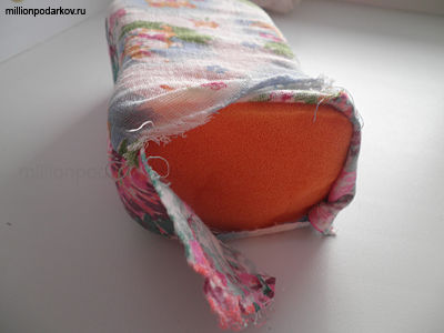 Выкраиваем из ткани кусочки так, чтобы они соответствовали размерам губки и сшиваем.