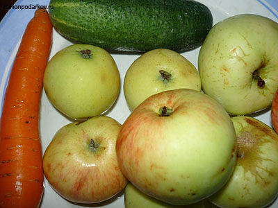 Для того, чтобы сделать поделки из овощей и фруктов "Человечек" нам необходимо приготовить яблоки, морковь и огурец. Так же потребуется нож, разделочная доска и спички.