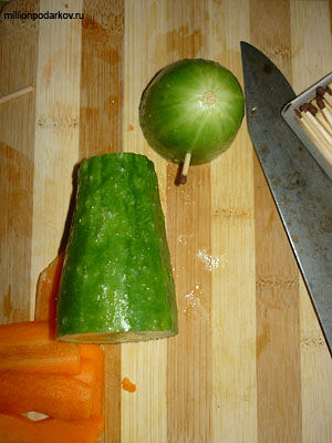 Для того, чтобы сделать забавные поделки из овощей "Девочка" нам потребуется огурец, морковь и спички. Так же потребуется нож и разделочная доска.