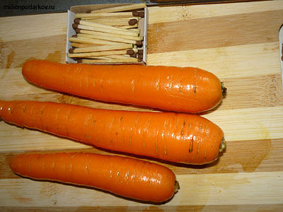 Для поделки из овощей жираф нам потребуется 3 морковки (одна из них запасная), спички, нож и разделочная доска.