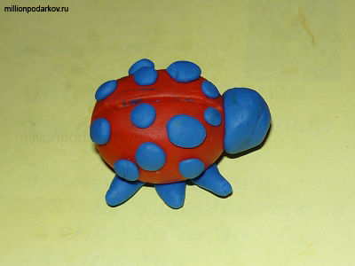 Соединяем детали вместе. Покажите ребенку, как необходимо приклеить лапки, голову и пятнышки. После этого стеком проведите линию на спинке божьей коровки обозначающую крылышки. Поделки из пластилина для младшего дошкольного возраста "Божья коровка" готова!