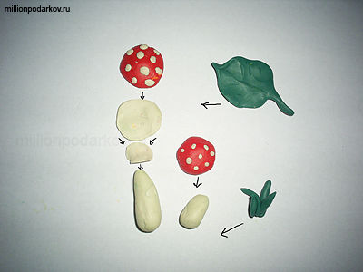 Сделаем из белого пластилина ножки гриба, воротничок, из красного – шляпки. Добавим белые пятнышки. Из зеленого сделаем травку и листик. Стрелочками на фотографии обозначено, куда что присоединять.