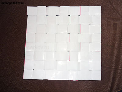 Плетем из бумажных полос коврик, просовывая одну под другую. Склеивая их между собой.