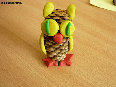 Приклеиваем части поделки к шишке. Изготовление поделки из шишек, как сделать сову подошло к концу.