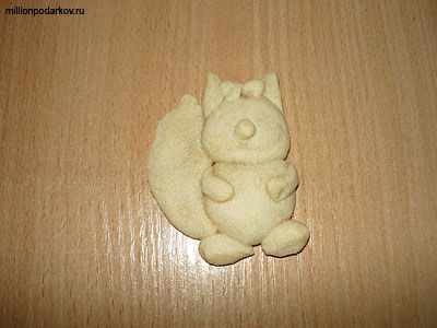 Лепим из теста фигурку белочки. Делаем в верхней части поделки отверстие для нитки.