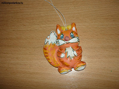 Раскрашиваем белочку, вставляем нитку в отверстие. Изготовление поделки из соленого теста для Нового года "Игрушка - белка на ёлку" законченно.