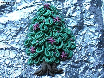 Выкладывая петельки, уменьшаем их количество в каждом ряду. Защипываем кончики петелек последнего ряда в один край, чтобы получилась верхушка елочки. Из розового теста слепить снежинки, а из белого шарики и украсить елочку. Снежинки желательно высушить отдельно, а потом приклеить в основе.