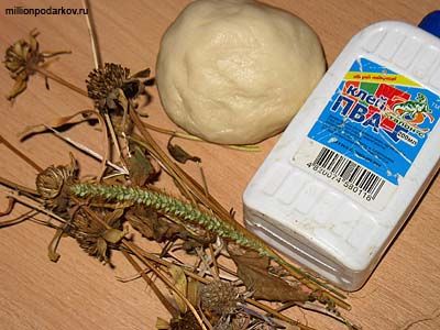 Замесим соленое тесто, для этого нам потребуется вода, соль, мука. Приготовим сухие травы и клей ПВА.