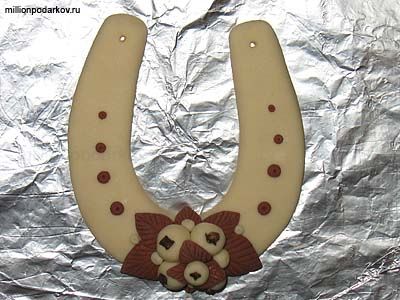 Из коричневого теста лепим листочки нужного размера и толщины, наносим стеком рисунок и выкладываем на подкове.