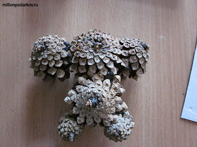 Для этой поделки из сосновых шишек "Чебурашка" вам потребуются 6 сосновых шишек (4 среднего размера и 2 маленькие), так же вам потребуется пластилин и картон.