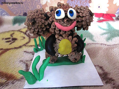 Ставим Чебурашку на картон. Лепим из зеленого пластилина травку. Изготовление поделки из сосновых шишек "Чебурашка" подошло к концу. Поделка готова!