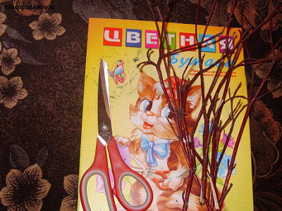 Для изготовления поделки к 8 марта своими руками нам потребуются ветки, цветная бумага (красная), ножницы и клей. Ветки лучше брать не слишком пушистые.