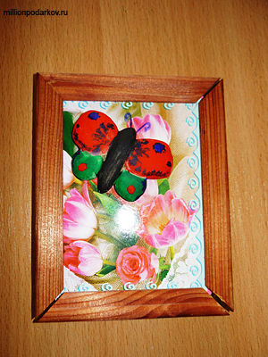 Вырезаем из открытки кусочек с изображением цветов. Вкладываем его в рамочку. Затем приклеиваем готовую бабочку из теста с помощью ПВА на открытку. Панно готово!