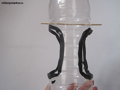 Прорежем в бутылке 2 отверстия друг напротив друга. Оклеим их изолентой - острые края бутылки не дадут птице удержаться на краю. Чуть выше отверстий проткните бутылку насквозь и вставьте деревянную шпажку. на ней мы закрепим скрепку , загнутую в форме крючка и насадим на нее кусочек сала