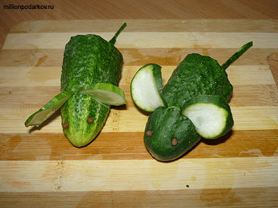 Разрезаем один огурец на пополам. Из второго вырезаем ушки и хвостики.