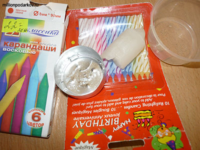 Для того изготовления поделки на Рождество "Свеча" вам потребуется приготовить свечки для торта, половинку хозяйственной свечи, восковые карандаши, нож, железную баночку, чтобы топить воск, небольшая тара для будущей свечи.