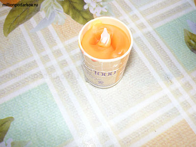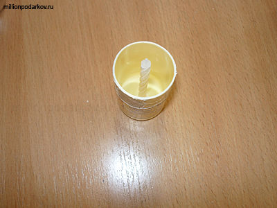 В тару для будущей свечи ставим свечку для торта. её мы используем исключительно для того, чтобы у нас был фитиль.