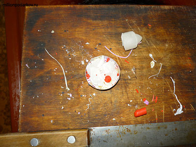 В железную баночку кладем парафин и стругаем туда восковой карандаш. Карандаш нам нужен для того, чтобы у нашей свечи был красивый цвет.