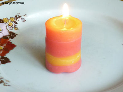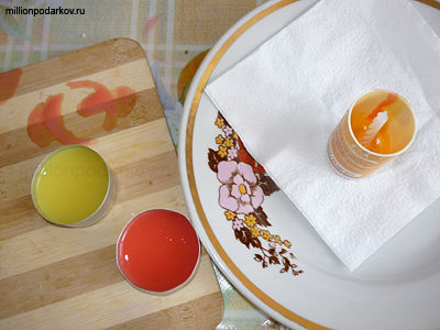 Воск растапливаем и выливаем в тару. Если вы хотите сделать двух цветную или трехцветную свечу, то вам необходимо растопить парафин в разных емкостях и в каждую добавить стружку воскового карандаша нужного вам цвета. Когда будите выливать слои в тару, дождитесь пока первый слой немного застынет, тогда вы исключите смешивание цветов, но если вы хотите, чтобы цвета плавно переходили из одного цвета в другой, то лейте воск сразу же на неостывший предыдущий парафиновый слой.