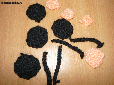 Вяжем части нашей обезьянки: ушки, животик и голову вяжем в форме кружков, а лапки в виде шнурков.