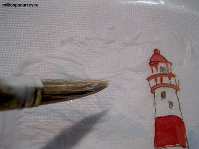 Для большей схожести с вышитой картиной в высохшем рисунке пробивайте дырочки. высохшая салфетка полупрозрачна и вы легко увидите где на канфе нужные отверстия. такая работа займет у вас немного времени, если это небольшой мотив.