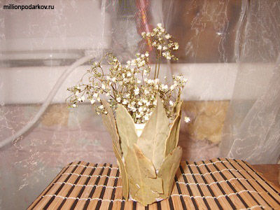 К основе вазочки приклеиваем постепенно лавровые листы. Желательно брать целые лавровые листочки. Когда вся основа будет обклеена, поделка с ребенком "Лавровая вазочка" будет готова.
