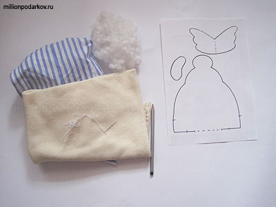 На бумагу нанесите выкройку как на фото. Приготовьте цветную ткань. Одна пойдет на крылья, другая на шарфик. Подберите их так, чтоб они отличались, но не слишком контрастировали друг с другом.