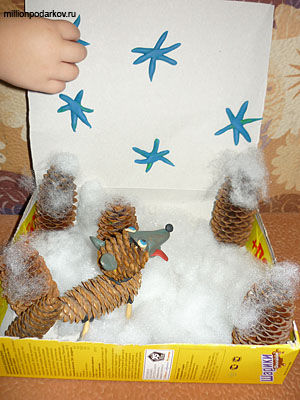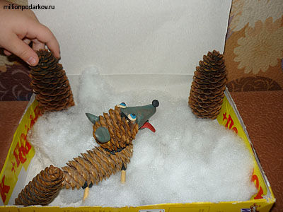 Ставим в коробку волка и шишки, которые будут играть роль ёлочек.