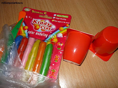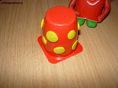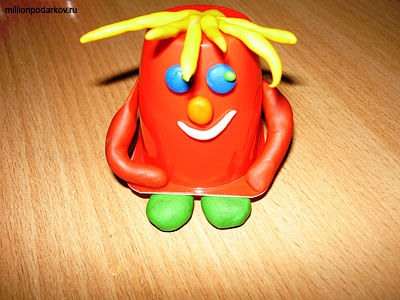 Переворачиваем стаканчик от растишки. Лепим из пластилина глазки, носик, ротик, ручки, ножки, и волосики. Приклеиваем всё это к стаканчику от растишки.