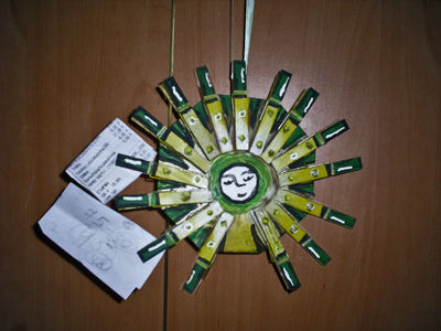 Красим поделку бронзовой краской с помощью аэрозольного баллончика. После этого начинаем декорировать изделие акриловыми красками. Рисуем посередине круга белый кружок с лицом. Вокруг красим зеленой краской. Разрисовываем прищепки зеленой и желтой краской. Крепим ленту для подвешивания поделки. Теперь Ваши квитанции и мелкие документы не будут валяться по всему рабочему столу, а сохранятся в одном месте, где Вы без труда сможете их найти.