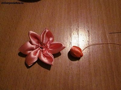 Нитку затягиваем и получаем цветок. После этого вырезаем круг из оранжевой ленты и кладем на него бусину.