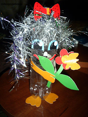 Для этого вам пригодится цветной картон и цветная бумага, пластиковая бутылка, ножницы и клей.