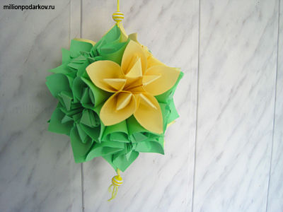 Из цветов соберите шар согласно рисунку. Сверху прикрепите шнурок. Снизу кисточку с бусиной.Надеюсь, что это пошаговое изготовление помогло вам собрать модуль кусудамы супершар поделки.