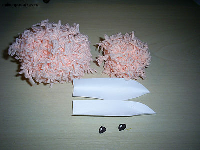 С помощью клея ПВА соединяем все составные части. Склеиваем помпоны. Приклеиваем ушки и глазки. Чтобы получилась вытянутая мордочка кролика, намажем меньший помпон клеем и сформируем нужную нам форму головы. Такие самодельные поделки станут хорошим украшением помещения или превратятся в забавный подарок для любимых людей. Подарки своими руками сделаны с душой, а это самое главное.