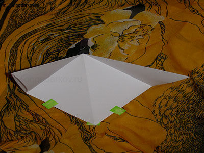 Переворачиваем нашу заготовку. Верхний угол делим на три части и заворачиваем обе стороны с небольшим захлестом на среднюю линию