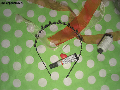 Из одной из лент сложите бант и приклейте на ободок не в центре, а ближе к краю.