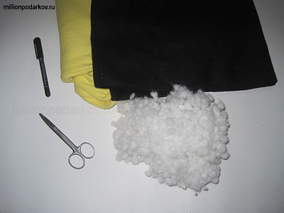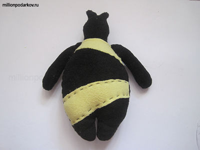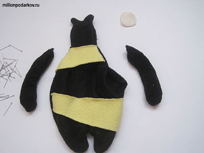 К лицевой стороне игрушки пришиваем желтые полосы. Сшиваем обе стороны лицевыми сторонами внутрь - оставив небольшое отверстие для набивки. Выворачиваем игрушку.
