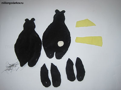 Сперва наметим на бумаге, а после перенесем выкройку на ткань. Вырезаем выкройку- 2 детали туловища, 4 детали рук, и по одной детали лица и желтых полосок. так же выкроим крылья.