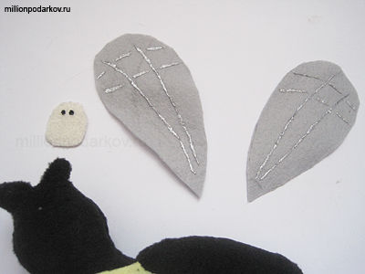 Вырежем овал для лица и крылышки. Красками по ткани я сделал рисунок - глазки на лице черным, а на крыльях разметку как у пчелы серебряной краской.